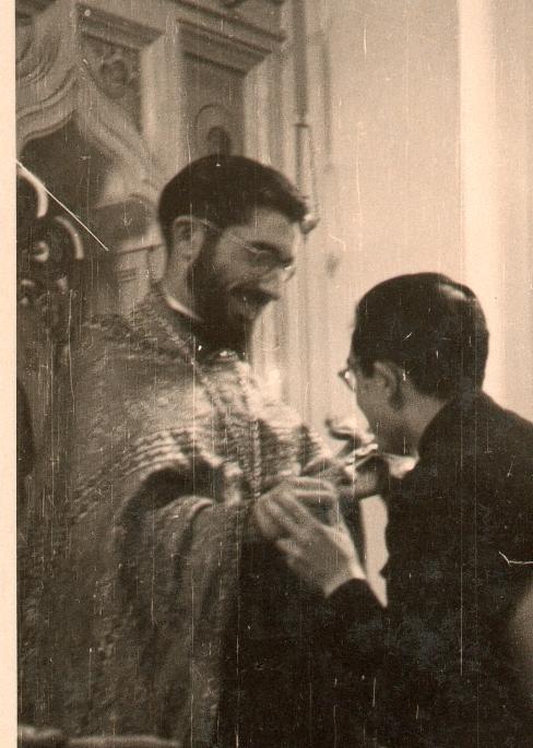 Описание: 1954: posle rukopolozhenia presviter Mixail prepodaet celovat' krest kliriku | |||